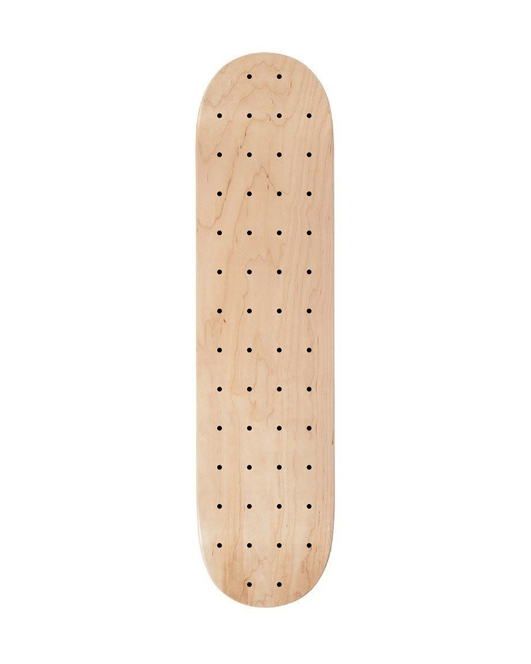 Blank skateboard deck, with additional drill holes extending the truck mounting holes into a uniform grid referencing the evenly spaced holes on pegboard that allow for customisable storage using hooks, shelves, and other accessories.
