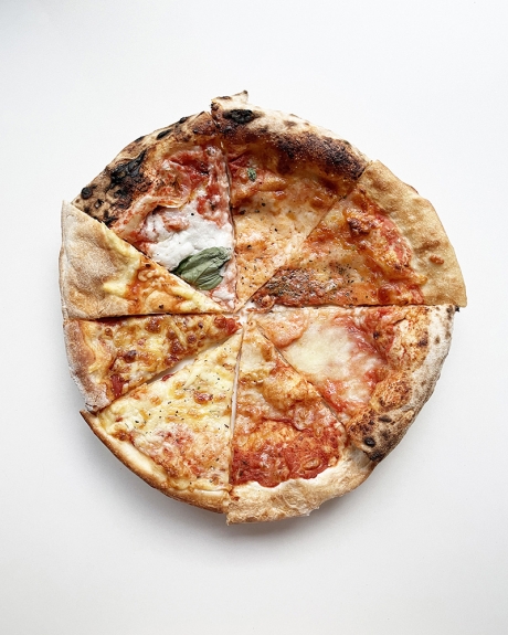 Eight Margherita pizzas are ordered from eight different pizzerias, to arrive at the same address. Each Pizza is divided into the standard eight slice configuration. One slice from each pizza is taken and arranged to form a set of new composite pizzas, each containing the eight different interpretations of a pizza Margherita.