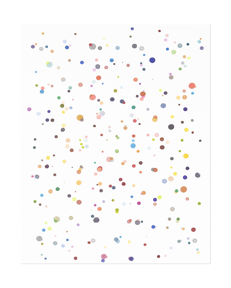 Two complete set of Pantone marker pens standing on their base with their nibs facing upright. Sheets of paper, one at a time, where carefully placed to rest on the bed of pen nibs. Once the paper absorbed ink the page was re positioned on the second set, after being flipped or rotated. Pens where left in their position or rearranged in a random compositions. Some prints have two print layers, other as many as ten. Coloured spots overlap, collide, mix, and align resulting in macro, micro colour constellations.